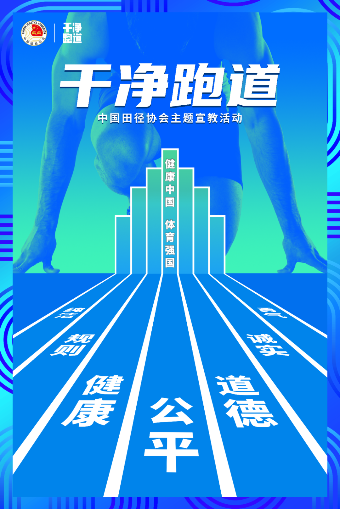 将“干净跑道”的内涵在赛道上予以展示,并以明确的态度传递出各地政府、赛事主办机构致力于通过“干净跑道”田径价值观的倡导,以及对“干净跑道”主题宣教活动的持续支持,助力“体育强国”和“健康中国”目标的实现。